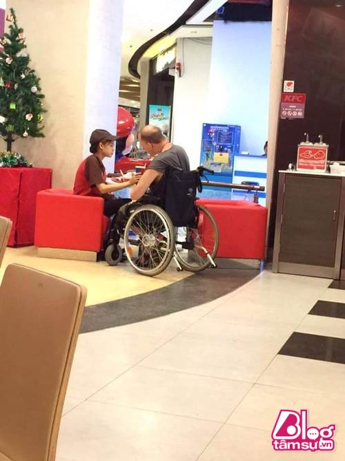 Vào ngày 27/12 vừa qua, hình ảnh một nữ nhân viên Thái Lan tại quán ăn nhanh giúp đỡ người tàn tật ăn đã gây sốt trên mạng xã hội. Người đàn ông này mặc áo phông đen, đang ngồi trên một chiếc xe lăn với thân hình khá cao lớn so với nữ nhân viên, người đang giúp đỡ ông ăn uống.