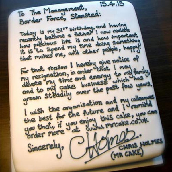 Tự tay anh đã làm chiếc bánh gửi đến các sếp của mình. "Tôi nghĩ ông ấy rất ngạc nhiên. Có một chút rắc rối khi làm bánh vì phải viết nhiều chữ quá nhưng tôi hy vọng lá đơn sẽ để lại hương vị tuyệt vời khi họ thưởng thức" - Holmes nói.