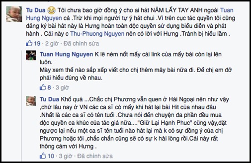 “Chắc chị Phương vẫn quen ở hải ngoại nên như vậy, chứ lâu nay ở Việt Nam các ca sĩ có mấy khi hát lại bài Hit của nhau đâu. Nhất là các ca sĩ có tên tuổi. Chưa nói đến chuyện đa phần đều mua độc quyền ca khúc của tác giả nữa. “Giữ lại hạnh phúc” cũng vậy, đặt ngược lại nếu một ca sĩ tên tuổi nào hát lại mà không có sự đồng ý của chị Phương hoặc tôi, chắc chắn cũng sẽ có sự không hài lòng rồi. Cái này rất thông cảm với Hưng”, Tú Dưa còn giải thích thêm.