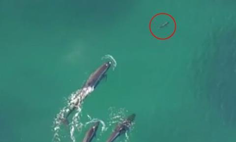 Trong đoạn clip ghi lại, đàn cá giả hổ kình đã nhanh chóng tóm gọn con cá mập nhỏ bé và dìm nó xuống nước.