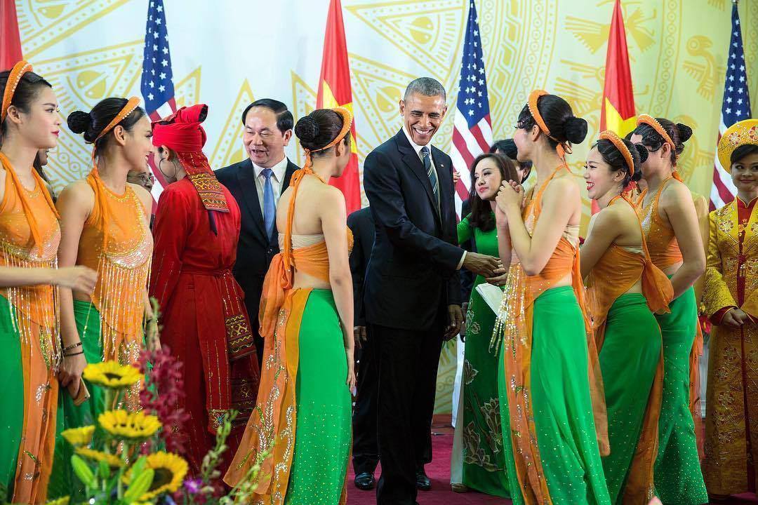 Sau khi buổi trình diễn xong thì T.T Obama đi xuống bắt tay các nghệ sĩ và cám ơn họ nên mới có tấm hình nhiều cô gái mặc yếm đứng trước mặt Obama, chứ không phải những cô gái nầy được đưa lên đại diện phụ nữ miền Bắc đón tiếp.