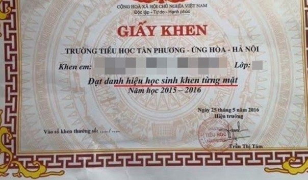Tổng kết năm học 2015-2016, học sinh lớp 1 trường Tiểu học Tân Phương (huyện Ứng Hòa, Hà Nội) nhận được giấy khen ‘Đạt danh hiệu học sinh khen từng mặt’ khiến phụ huynh bối rối.