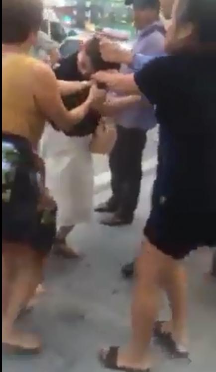 Nhiều người dân vào can ngăn, nhưng luôn bị nhóm người phụ nữ này đẩy ra và nói: "Không phải việc của anh". (Ảnh cắt từ clip)