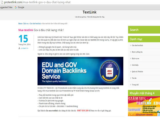 Không những thế, độc giả này còn phản ánh thông tin nhiều đơn vị ngang nhiên, công khai rao bán trên mạng các link liên kết có địa chỉ tên miền đuôi “.gov.vn” (theo Thông tư 24 ngày 18/8/2015 của Bộ TT&TT quy định về quản lý và sử dụng tài nguyên Internet, tên miền “.gov.vn” dành cho các cơ quan nhà nước ở trung ương và địa phương - PV). Chẳng hạn như, qua tìm hiểu của ICTnews từ thông tin của độc giả phản ánh, các trang govvn.net, textlinkuytin.com, protextlink.com…hiện đang công khai rao bán link trên các trang web “.gov.vn” với các mức giá từ 100.000 đồng đến 300.000 đồng/tháng cho mỗi textlink.