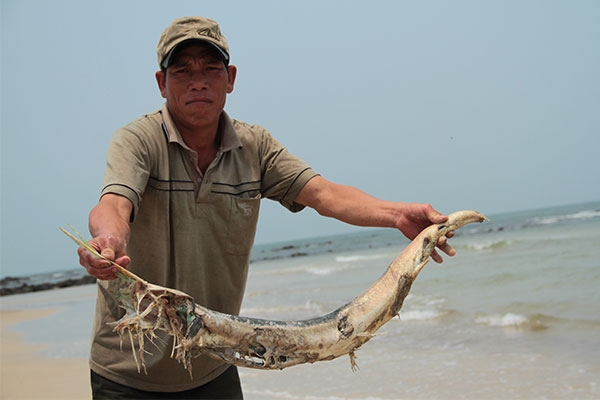 Một ngư dân đau đớn cầm trên tay xác cá chết dạt vào bờ biển thuộcthôn Vịnh Mốc, xã Vĩnh Thạch, Vĩnh Linh, Quảng Trị (chụp ngày 28/4) - Ảnh: Vĩnh Yên