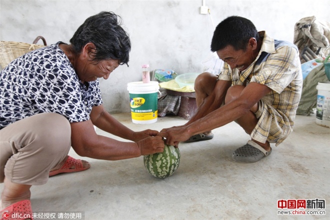 Vợ chồng ông dùng sức tách quả dưa ra nhưng không được.