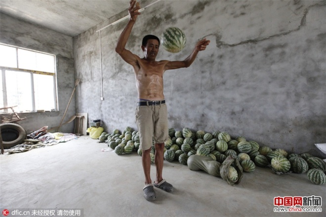 Trong hình, ông Cung đang thử ném dưa để chứng minh nó không vỡ. Chỉ khi được ném từ độ cao trên hai mét, quả dưa mới nứt ra một khe nhỏ.