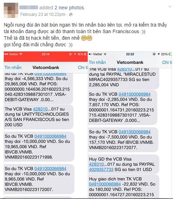 Dòng trạng thái trên được facebooker D.A đăng tải cùng hai bức ảnh chụp màn hình tin nhắn do phía ngân hàng Vietcombank báo về. Theo đó, số tiền trong tài khoản của D.A lần lượt bị rút với các mệnh giá khác nhau. Khi số tiền còn lại quá ít, phía người rút tiền không rõ danh tính tại Sanfranciscous tiếp tục rút từng đô la một cho đến khi cạn kiệt mới thôi.