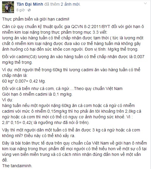 Liên quan đến thông tin ăn cá bị nhiễm kim loại nặng cadimi có thể gây ung thư, tối 1/8, ông Nguyễn Lương Tâm - Giám đốc Trung tâm Y tế dự phòng tỉnh Hà Tĩnh đã đăng status với tiêu đề “Thực phẩm biển và giới hạn cadimi” lên facebook trang cá nhân (Tân Đại Minh) để lý giải vấn đề trên.