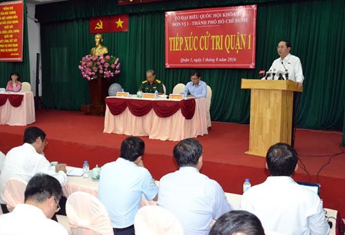 Tại buổi tiếp xúc, cử tri quận 1 và quận 3 đã bày tỏ sự phấn khởi trước kết quả cuộc bầu cử ĐBQH khóa XIV và đại biểu HĐND các cấp nhiệm kỳ 2016-2021, kết quả Kỳ họp thứ nhất, QH khóa XIV, nhất là việc QH đã kiện toàn các chức danh lãnh đạo QH, Nhà nước, Chính phủ.