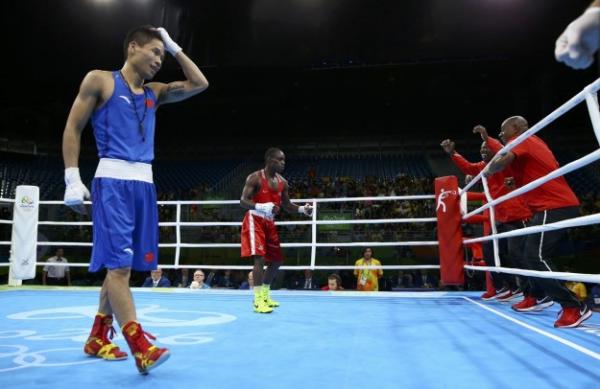 Peter Warui ăn mừng cùng các HLV của mình, trong khi tay đấm người Trung Quốc lủi thủi ra về với gương mặt ủ rũ.
