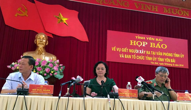 Chiều ngày 18/8, tại Hội trường Tỉnh ủy, tỉnh Yên Bái đã tổ chức họp báo về vụ giết người xảy ra tại Văn phòng Tỉnh ủy và Ban Tổ chức Tỉnh ủy. Đồng chí Phạm Thị Thanh Trà - Ủy viên Ban Chấp hành Trung ương Đảng, Phó Bí thư Tỉnh ủy, Chủ tịch UBND tỉnh chủ trì họp báo.