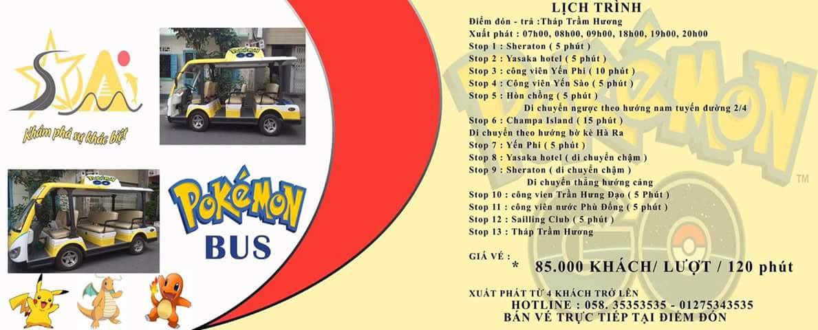 Với 85.000 Đồng/1 lượt khách (chỉ xuất phát khi có đủ 4 khách trở lên, tổng thời gian là 120 phút), Pokemon Bus cung cấp dịch vụ bắt Pokemon hiệu quả do tuyến đường “phủ sóng” gần như đầy đủ các Pokestop nổi tiếng, đẹp và thường xuyên có Lure Module (thiết bị thu hút Pokemon) của Nha Trang. Dịch vụ cũng ghi rõ sẽ đi với tốc độ chậm, thường xuyên dừng lại để tạo điều kiện cho game thủ “săn bắt”.