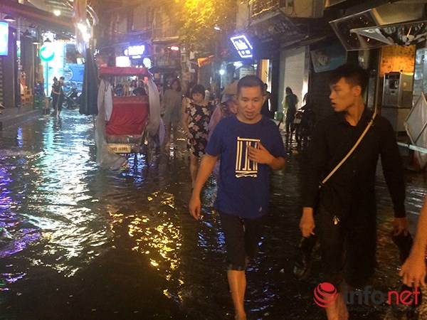 Sau cơn mưa lớn tối qua, khu phố đi bộ trên phố cổ Hà Nội bị ngập trong nước. Nhiều người cho rằng do cuối tuần, nhiều khách vứt rác ra đường nên khi mưa lớn, rác chui xuống cống khiến nước bị tắc, không thoát được dẫn đính tình trạng trên.