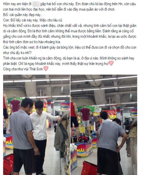Hai cha con trong hình ăn mặc không đến nỗi nghèo khổ, nhưng nhìn qua ai cũng đoán họ là dân lao động bình thường. Sẽ không có gì đáng chú ý nếu như hai cha con không bộc lộ tình cảm dành cho nhau tại quầy bán đồ nam.