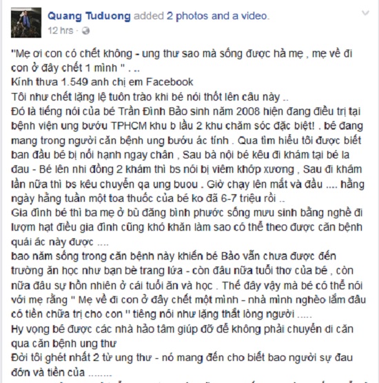 Đời tôi ghét nhất 2 từ ung thư – nó mang đến cho biết bao người sự đau đớn và tiền của. Hy vọng các bạn có thể chung tay giúp đỡ mang đến cho bé sự sống để bé có thể đến trường ăn học như bao bạn cùng lứa …”