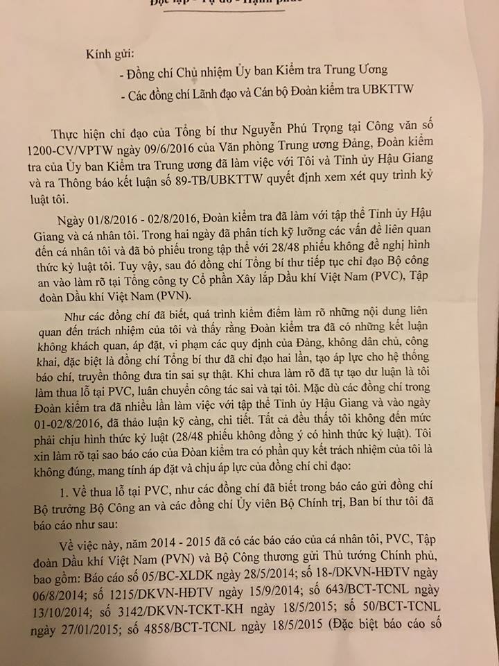 Lá đơn của Trịnh Xuân Thanh gửi hội đồng kỷ luật trung ương, uỷ ban kiếm tra trung ương đảng toàn văn dưới đây.