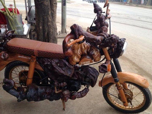 Từ một chiếc xe Honda đời cũ cũ nát, qua bàn tay của những con người khéo léo đã cho ra đời một chiếc hoàn toàn mới. Bàng các mảnh gỗ, chiếc Honda trông nặng nhọc hơn nhưng không thể phủ nhận nó cực kỳ ấn tượng. Độ “dị” của xe không chỉ thể hiện ở các chi tiết ốp gỗ mà còn ở sáng tạo mới, như phía đuôi xe xuất hiện thêm “đèn pha” ngược và tay nắm yên đục khắc từ gỗ.