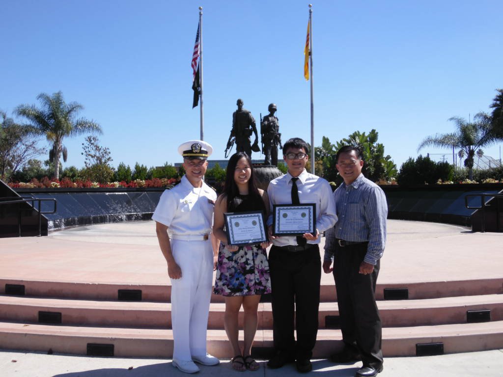 Hải Quân Thiếu Tá Chris Phan và cựu Trung Tá Bộ Binh Thọ Nguyễn, hai đồng sáng lập viên VAUSA, trao học bổng mỗi phần trị giá $2,000 cho hai sinh viên Juliana Nghiêm, 19 tuổi, sinh viên UCLA ban Sinh Hóa, cư dân Simi Valle; Christopher Nguyễn, 18 tuổi, sinh viên UCI ban Công Nghệ Điện Toán, cư dân Garden Grove.