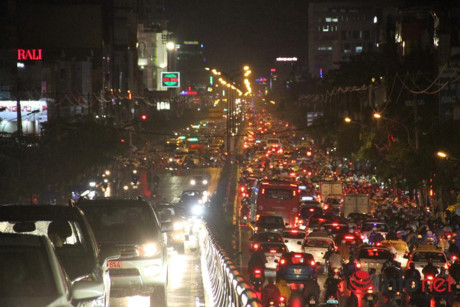 Cả ngàn chiếc xe máy, ô tô chết đứng dưới mưa trên đường Hồng Hà