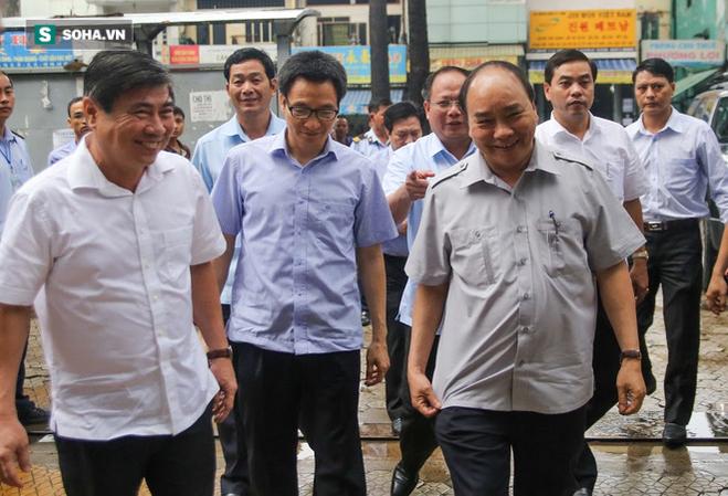 Khoảng 5h45 Thủ tướng Nguyễn Xuân Phúc cùng Phó Thủ tướng Vũ Đức Đam, Chủ tịch UBND TP Nguyễn Thành Phong, Phó bí thư thường trực Tất Thành Cang, Bộ trưởng NN và PTNT Nguyễn Xuân Cường... về huyện Bình Chánh trong cơn mưa lớn.
