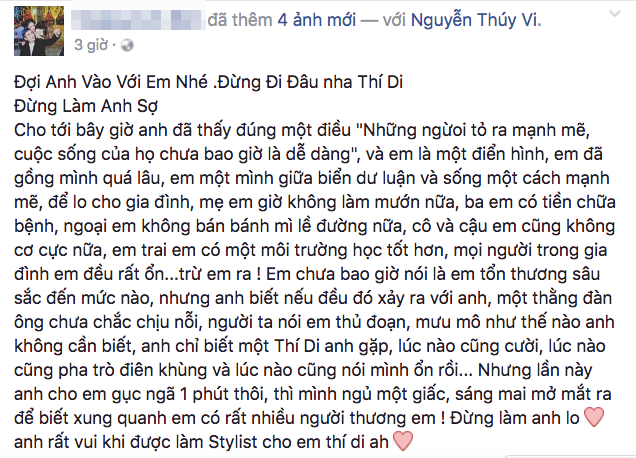 Liên lạc với stylist, cũng đồng thời là một người bạn chơi thân với Thúy Vi, người này cho biết sức khoẻ của Vi hiện tại đang rất yếu do uống thuốc ngủ tự tử vào chiều ngày 14/10.
