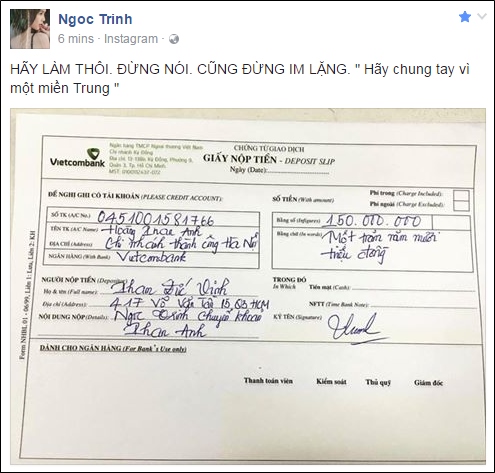 Chia sẻ trên trang cá dòng trạng thái ngắn ngủi nhưng đầy ý nghĩa, mỹ nhân của làng giải trí Việt – người được mọi người đặt cho biệt danh “nữ hoàng nội y” Ngọc Trinh viết: “Hãy làm thôi. Đừng nói. Cũng đừng im lăng. “hãy chung tay vì một miền Trung”.