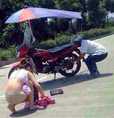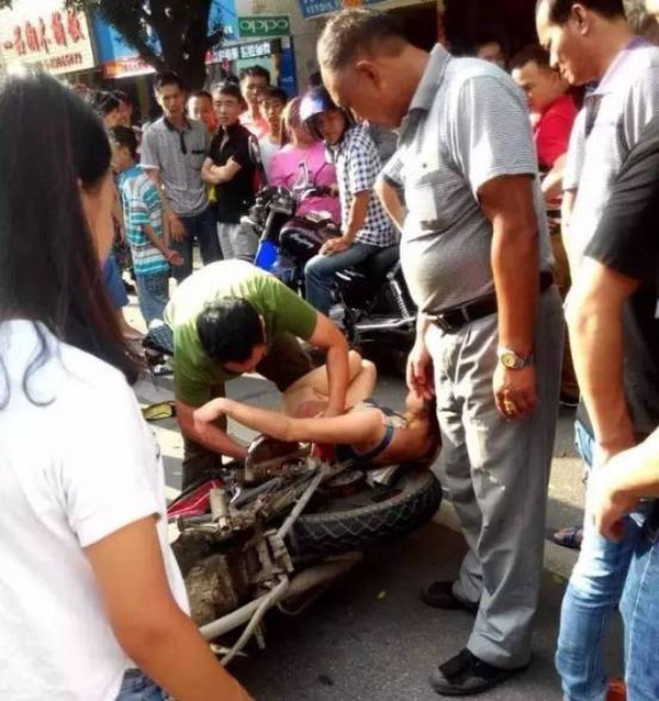 Mới đây, hình ảnh của người phụ nữ ở Đông Hoản, Quảng Đông té nhào ra đường do mặc váy dài ngồi sau xe máy đã thu hút sự chú ý của cộng đồng mạng. Bức ảnh được một người có mặt tại đó chụp và tường thuật những gì đã xảy ra khi họ chứng kiến tai nạn này. Một người đàn ông chở cô gái bằng xe máy lưu thông trên đường. Tuy nhiên, do chiếc váy quá dài nên đã bị cuốn vào bánh xe dẫn đến việc người đàn ông lạc tay lái, khiến cô gái ngã nhào xuống đất.