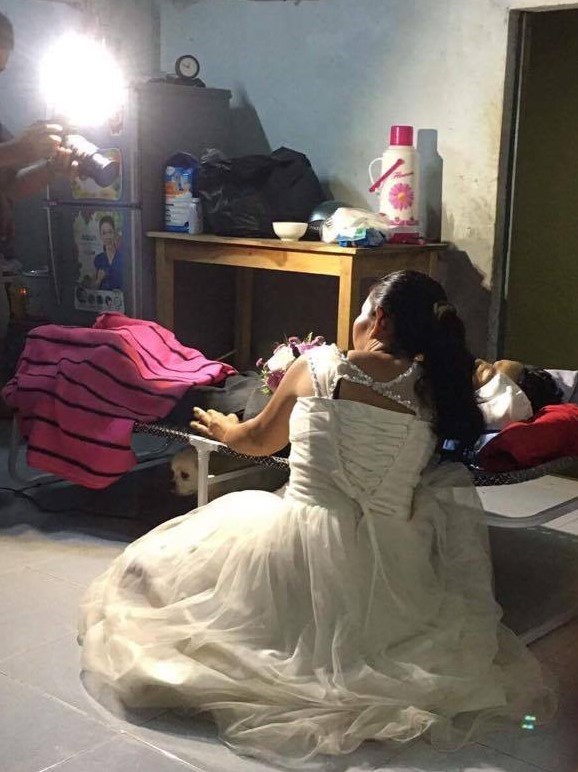 Ngồi bên cạnh anh, chị Loan mặc chiếc váy trắng đính kim sa, tay cầm bó hoa cưới, khuôn mặt chưa kịp trang điểm buồn rười rượi. Đây là đám cưới mà cả đời chị ước mơ, nhưng cũng là ngày chị mất đi người mình yêu thương nhất.