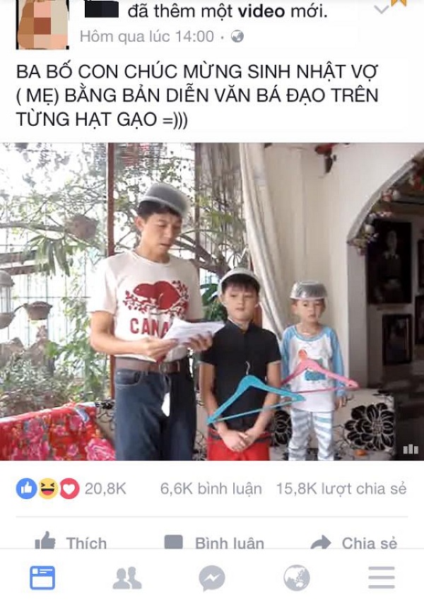Với dòng trạng thái ngắn gọn nhưng đầy xúc tích: ‘Ba bố con chúc mừng sinh nhật vợ (mẹ) bằng bản diễn văn bá đạo trên từng hạt gạo’. Kèm theo đó là đoạn clip ghi lại cảnh ba bố con nhà họ Lê đầu đội bát nhựa, hai cậu bé con một lớn một bé còn đeo thêm hai chiếc móc áo trước ngực, vẻ mặt nghiêm túc như khi đứng chào cờ, hai tay chắp ra trước im lặng đứng cạnh nghe bố đọc diễn văn chúc mừng sinh nhật mẹ khiến người xem không khỏi ‘bật cười’ vì độ đáng yêu của ba bố con Lê Xuân Trí, Lê Hoàng Bảo Thiên, Lê Hoàng Bảo Vì.