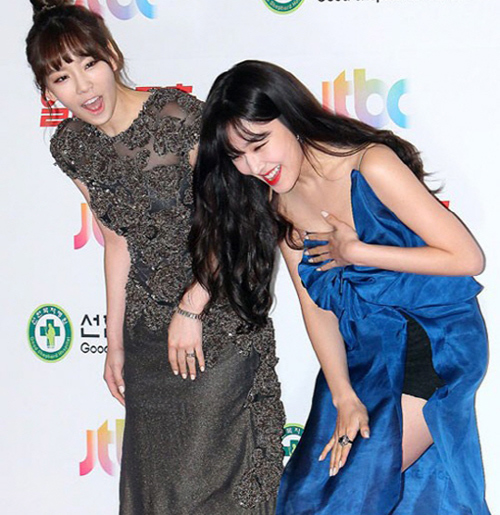 Với các ngôi sao thần tượng K-Pop, khoảnh khắc cúi thấp người được coi là một cách để thay cho lời chào tới người hâm mộ trong mỗi sự kiện. Đôi khi các người đẹp trẻ tuổi gặp không ít lúng túng với những bộ váy cúp ngực gợi cảm mà vẫn phải cúi chào. Soyou nhóm Sistar cứ để mặc thân hình sexy khi cúi người trên thảm đỏ.