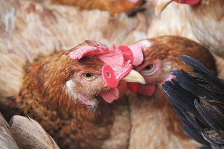 Bà Bùi Bích Liên, chủ một trang trại nuôi gà ở tỉnh Hòa Bình, đã áp dụng mô hình chăn nuôi theo công nghệ EM khép kín của Nhật. Ở đây, khi được khoảng 3 tháng tuổi, gà được đeo kính đỏ để tránh mổ nhau và làm vỡ trứng.