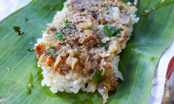 Một phần xôi ở đây từ 10 – 20 ngàn, tùy sức ăn. Xôi còn nóng hổi được trét pate, mỡ hành, đổ 1 thìa sa tế, rồi cho mấy miếng chả sắt mỏng, phủ chà bông rắc hành lên trên. Thông thường do sa tế rất cay nên chủ quán chỉ cho 1 thìa. Rồi khi khách ăn quen, tùy theo sở thích sẽ ăn cay nhiều, cay ít. Xôi ở đây vốn luôn được gói trong lá chuối cho đúng điệu. Nhưng hiện tại, do nhiều người muốn bỏ hộp giấy để tiện mang đi làm nên cô chủ cũng chiều khách.