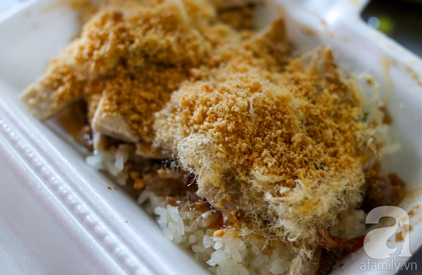 Rồi thêm chả, chà bông, đậu phộng. Tuy nhiên xôi để trong lá chuối vẫn có vị ngon hơn.