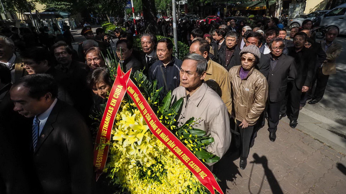 Nhiều giờ trước lúc Đại sứ quán Cuba mở cửa, hàng trăm cựu lưu học sinh Việt Nam tại Cuba, các thành viên Liên hiệp các tổ chức hữu nghị và Hội Việt Nam - Cuba đã tập trung xếp hàng trước cổng sứ quán để chuẩn bị vào viếng.