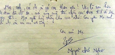 Trong thời khắc chờ thi hành án, Nghĩa đã viết vài dòng gửi về cho gia đình. Trong khổ giấy ngang với 8 dòng chữ, tử tù 30 tuổi viết những lời rỉ máu: “Mẹ, anh chị và các con thân yêu. Vậy là sau hơn bốn năm dài chờ đợi, cuối cùng cũng đến ngày con được trở về bên gia đình. Mọi người hãy mừng cho con nhé”. Bằng nét chữ run rẩy, Nghĩa cũng bảo: “Yêu mẹ, anh, các chị và các con vô cùng”. Cuối thư, cựu sinh viên đại học Ngoại thương viết: “Con của mẹ - Nguyễn Đức Nghĩa”. Lá thư trên được Nghĩa viết lúc 17h30 ngày 22/7. Dừng bút, Nguyễn Đức Nghĩa được cán bộ quản giáo bê cho bát phở gà nhưng anh ta cũng chỉ ăn được vài gắp rồi buông đũa.