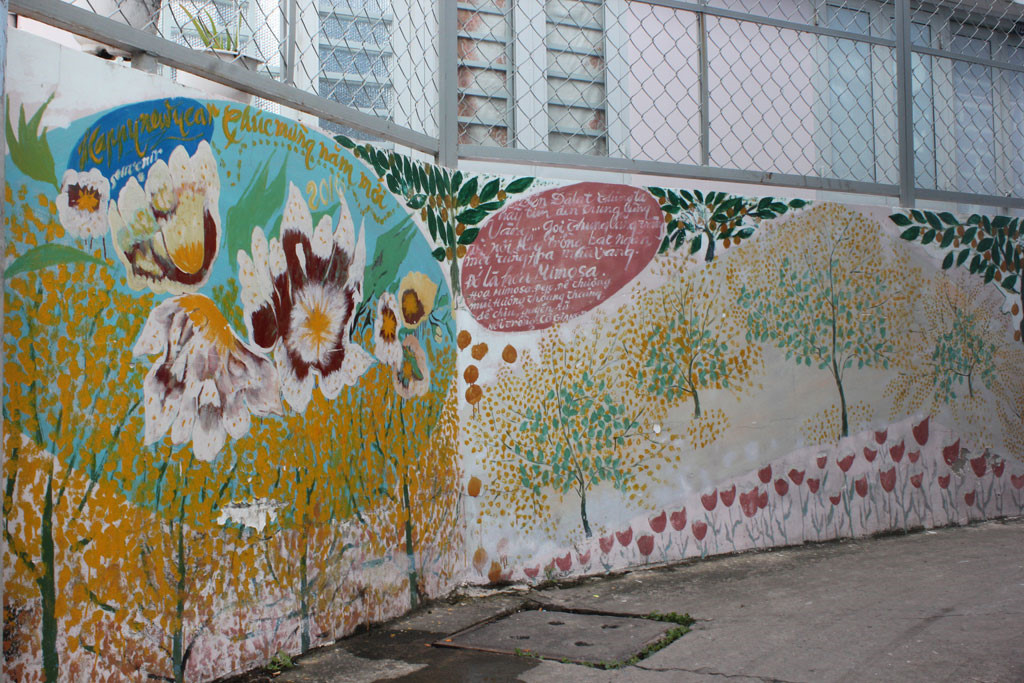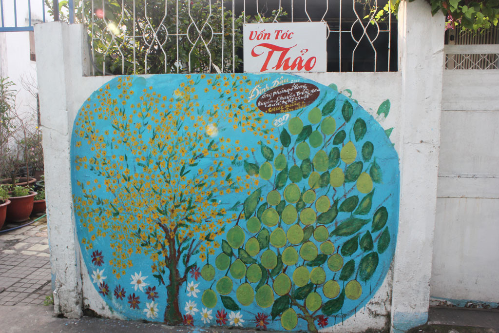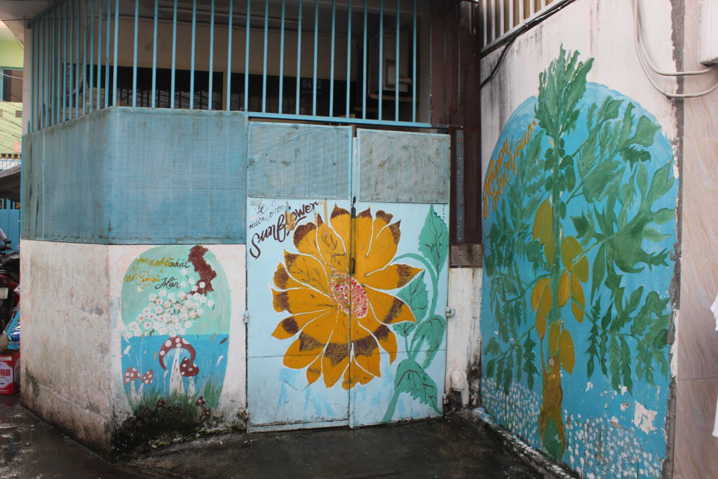 Tôi bị thu hút bởi những bức tranh trên tường trong con hẻm 64 Nguyễn Khoái, quận 4, TP.HCM. Lần theo những bức vẽ, tôi bắt gặp người đàn ông với mái tóc muối tiêu, sợi đen sợi trắng đang tỉ mẩn vẽ từng bông hoa trên tường.
