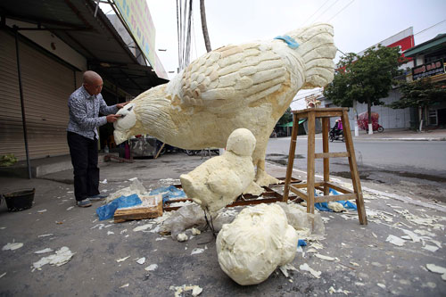 Những chú gà được thiết kế trên khung sắt, bọc lưới thép và vỏ ngoài xốp chịu nhiệt. Gà sau khi được lên khung sẽ được phết bột màu, trộn keo tạo độ bám chắc và bền màu với thời gian.
