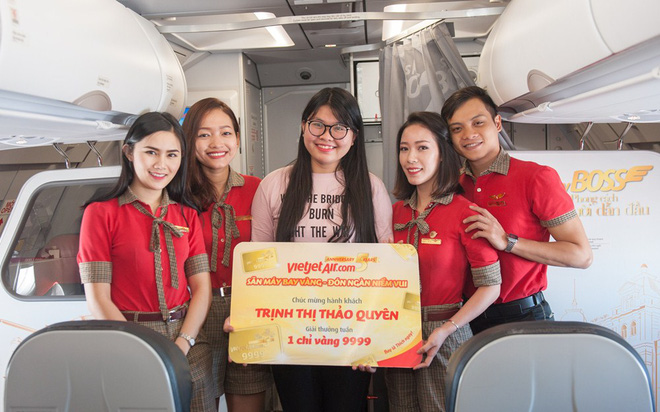 VBF-Có thể nói năm nay là 1 năm vô cùng khởi sắc của hãng hàng không Vietjet. Dù chỉ mới ra đời thế nhưng hãng đã sớm nhận được sự ủng hộ của khách hàng bởi những chuyến bay giá rẻ hấp dẫn. Nhân dịp năm mới hãng còn tổ chức khá nhiều chương trình khuyến mãi khiến hành khách đi máy bay phải bất ngờ.Niềm vui đã đến với hành khách Trịnh Thị Thảo Quyên (Thanh Hóa) khi trên chuyến bay từ Hà Nội vào TP.HCM chị đã nhận được quà tặng là 1 chỉ vàng 9999.