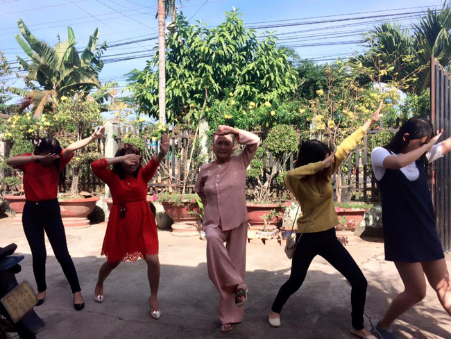 Trong bộ bà ba gấm màu hồng giản dị, bà cụ tạo dáng lúc thì như múa võ, khi lại giống động tác của Tôn Ngộ Không. Bà cũng không quên để ý cách tạo dáng xì teen của mấy đứa cháu gái để làm theo cho đồng bộ.