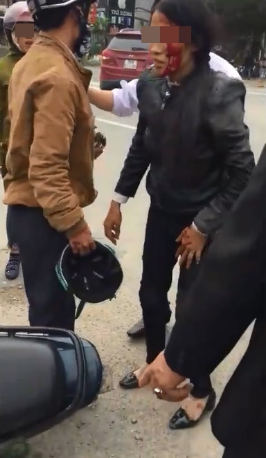 Cụ thể trong clip, một người phụ nữ bị chảy máu đầu, ngồi bệt dưới đất đầy mệt mỏi còn chồng chị ta thì đang tranh cãi kịch liệt với vài người khác - những người được cho là điều khiển xe va chạm với xe của đôi vợ chồng này.