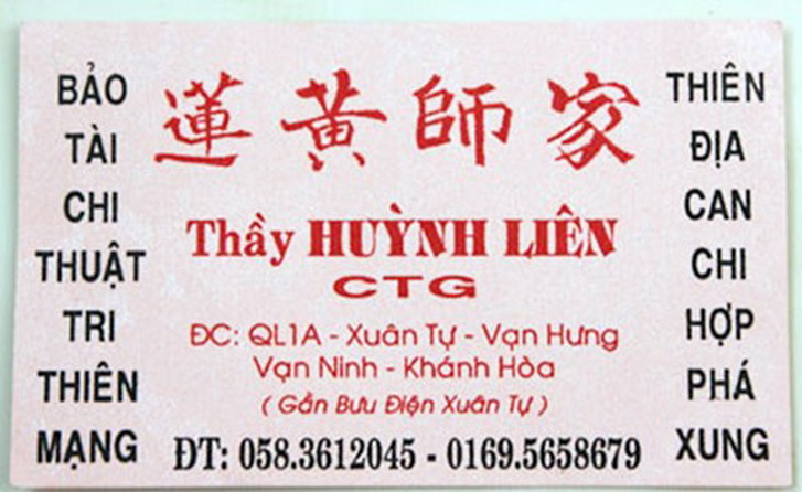 Không khó để phóng viên tìm đến nhà CTG Huỳnh Liên tại Xuân Tự, Vạn Hưng, Vạn Ninh, Khánh Hòa. Ngay trung tâm xã, trước một ngôi nhà ba tầng sơn xanh đẹp như một biệt thự có tấm biển lớn đề rõ Thày Huỳnh Liên với rất nhiều chữ Hán to nhỏ vây quanh. Vừa mới ngó mấy chậu cảnh to bự trước nhà, một bà sồn sồn chạy ra. Khi biết chúng tôi tìm đến để xem vận mệnh, bà đon đả: “May cho mấy chú, hôm nay thầy có nhà. Mọi ngày giờ này thầy còn đi làm việc nghĩa”. Mãi sau chúng tôi mới biết, thầy đi làm việc nghĩa là thầy đi làm thầy cúng. Phòng “làm việc” của thầy nằm ở gian sau, xung quanh ốp gỗ sáng bóng, bàn thờ thần bày lọ bông thơm phức. Thầy “Huỳnh Liên tái sinh” tuy có tuổi nhưng vẫn mạnh khỏe, hồng hào. Chưa ngồi ấm chỗ, thầy đã gõ nhẹ vào chiếc chuông nhỏ đặt trên mặt bàn: Các con xem gì? Tiền vận, hậu vận hay hướng nhà, cưới hỏi, tang ma? Cậu phóng viên mau mắn: Dạ, nhà con bị chuyện chi mà gặp lắm chuyện xui quá, con đến nhờ thầy xem có thư, hay bị ám quẻ gì chăng? Thầy nhìn kỹ cả mấy chúng tôi rồi cười nhếch mép, rồi nói: “Các con đã xem các sách của ta chưa? Nói rồi thầy đẩy về phía chúng tôi cả một chồng sách của tác giả Huỳnh Liên đã mất từ mấy chục năm trước: “Ta chính là chiêm tinh gia Huỳnh Liên, trước giải phóng, ta đã từng xem quẻ cho Tổng thống Nguyễn Văn Thiệu, Quốc vương Lào và Hoàng gia Campuchia, được thưởng tiền và vàng nhiều vô kể”.