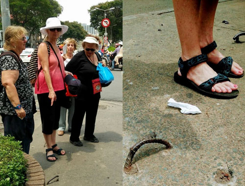 Đường Việt Nam luôn tiềm ẩn những nguy hiểm. Ngay cả đi bộ nếu không cẩn thận cũng sẽ bị thương. Một nữ khách du lịch đã trở thành nạn nhân của những móc sắt trên đường phố.
