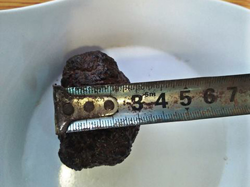 Trong khi làm sạch dạ dày, anh bất ngờ phát hiện 2 dị vật có tổng trọng lượng 300g. Hòn lớn hơn có chiều dài 5cm, rộng 3cm, nặng khoảng 200g, hòn nhỏ có chiều dài là 4cm, rộng 2cm và nặng 100g. Khi đem lên ngửi, thì có mùi thơm đặc trưng như thuốc bắc.