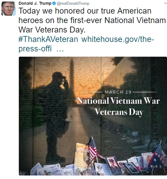 Hôm nay chúng tôi tôn vinh các anh hùng Mỹ thật sự của chúng tôi trong Ngày cựu chiến binh chiến tranh Việt Nam lần đầu tiên. (nguyên văn: Today we honored our true American heroes on the first-ever National Vietnam War Veterans Day.)