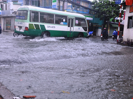Trận mưa lớn đầu giờ chiều 23-4 khiến tuyến đường Phan Huy Ích ngập nặng.