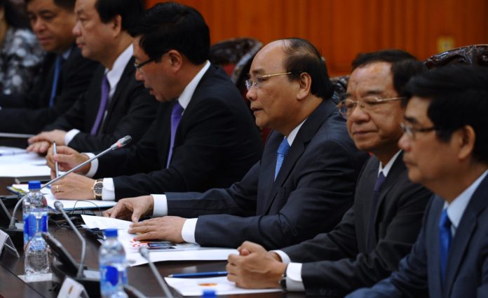 Thủ Tướng Nguyễn Xuân Phúc (thứ ba từ phải) trong buổi họp với Tổng Thống Barack Obama ở Hà Nội hôm 23 Tháng Năm, 2016.