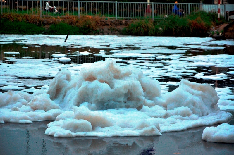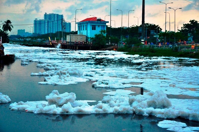 Những mảng bọt trắng trôi trên dòng kênh.