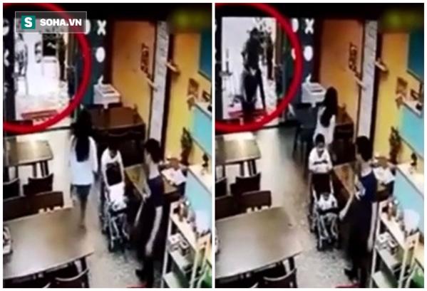 Ngay lập tức, chiếc xe máy bất ngờ lao thẳng về phía trước, tông mạnh qua cửa chính và nhanh chóng đổ sập vào gia đình 4 người đang gọi món ở bên trong nhà hàng.