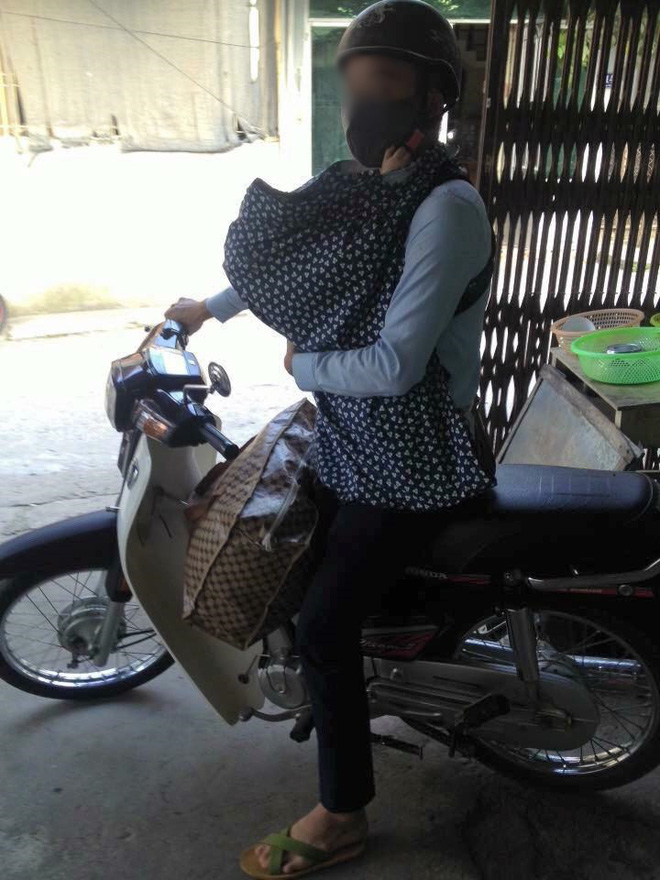 Xong em đi ra ngoài, lúc sau vào thấy cho hết quần áo hai bố con vào túi rồi. Em hỏi đi đâu, chồng em mới bảo khi nào đầu thơm thì hai bố con về. Em chụp vội được hai cái ảnh đấy. Xong em ra chỗ bạn em làm móng, về mới nhớ hai bố con bỏ đi rồi. Mọi người đẻ xong có ai lười như em không?".